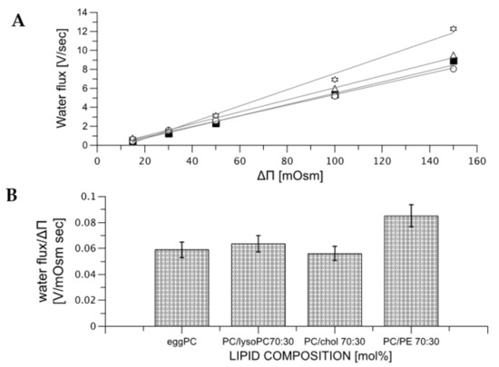 Figure 4. Panel (A) presents the water flux as a function of the osmotic pressure difference for membranes formed from different mixtures of lipids; (◯)—egg-PC/cholesterol 70/30 mol%, (△)—egg-PC/lysoPC 85/15 mol%, (▽)—egg-PC/lysoPC 70/30 mol% and (✯;)—egg-PC/PE 70/30 mol%. Panel (B) visualize the quantitative change of water flux (slopes for curves from panel (A) for selected membrane compositions).