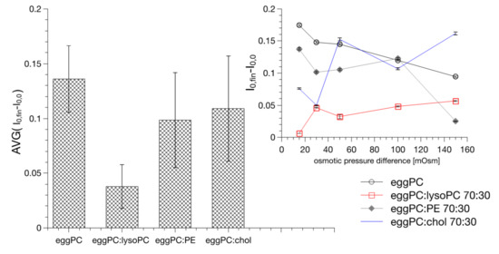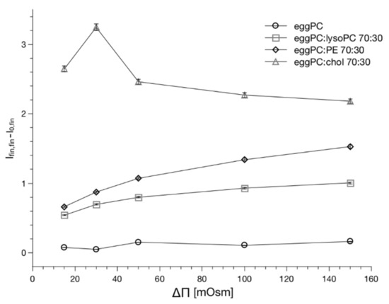 Equation (2) reduces to Equation (1) when the osmotic pressure difference is sufficiently high, i.e., above 200 mOsm so the t0 <10 msec (the value smaller than the dead-time of the instrument). Studies of water flow through the model lipid bilayers are typically performed at high osmotic pressure differences (typically higher than 200 mOsm). At high osmotic pressure differences, it has been sufficient to treat the lipid bilayer as a uniform and structureless hydrophobic slab when determining the osmotically driven water flow [45,58]. When approaching the equilibrium, the reduced vesicle inner volume will change the activity of remaining entrapped water as well as membrane topology. These changes will affect the optical properties of the liposome suspension [48]. Consequently, the parameters (I0,fin−I0,0) and (Ifin,fin−I0,fin) can be used to quantitate the change of liposome topology and dynamics. Figure 5 shows values of (I0,fin−I0,0) parameter determined for various osmotic pressure differences and lipid bilayer compositions. Data shows that the outer interface does not depend on the value of the osmotic pressure difference. The value is practically invariant on the lipid bilayer composition, except the membrane containing lysoPC. In this case the change of scattered light intensity is the smallest. The (Ifin,fin−I0,fin) values are different, they depend on both the lipid composition and on the osmotic pressure difference. Figure 6 shows (Ifin,fin−I0,fin) values as a function of the osmotic pressure difference for membranes formed from various lipid mixtures.