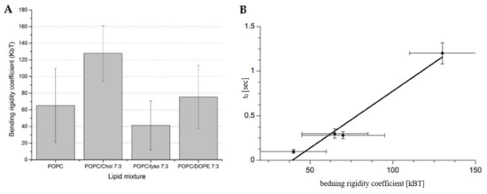 Figure 7. Plot (A) demonstrates the effect of different membrane compositions on their bending rigidity coefficient. ANOVA One-Way statistical test with 0.05 significance showed that populations PC-PC/chol 7:3 and PC-PC/lyso 7:3 are significantly different; there is no statistically significant difference when comparing PC with PC/PE 7:3. Plot (B) visualizes correlation between the probability of pore formation expressed by t0 and membrane bending rigidity coefficients.