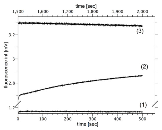 In order to measure the correlation between osmotic pressure difference and proton flow, liposomes labeled with fluorescein covalently attached to the lipid molecule were used. Due to the uniform labeling of the lipid bilayer, there are two distinct dye populations: one facing the outer and the other the inner aqueous phases. This makes it possible to monitor the proton concentration in water compartments separated by the lipid bilayer. When the liposome is simultaneously exposed to the osmotic pressure difference and pH gradients, the correlation between the rate of the volume change and the proton flux can be measured simultaneously. Figure 8 shows the time course of the fluorescence emitted by vesicles exposed to the pH gradient ( Δ pH equals to 1.4) in isosmotic conditions (Curve 2). The fluorescence traces can be divided into two phases: the rapid fluorescence changes (within second) corresponding to the deprotonation of the fluorescent dyes located on the outer surface of the vesicle and extended in time fluorescence rises, which are correlated with the proton fluxes across the lipid bilayer. During the second phase, the fluorescence intensity changes only slightly, showing that the extend of pH gradients dissipation is insignificant during the experiment. The intensity monitored for the extended period of time when there are no pH gradients demonstrates that the photo-bleaching effect is irrelevant (fluorescence intensity changes by less than 3% in more than 3 h).
