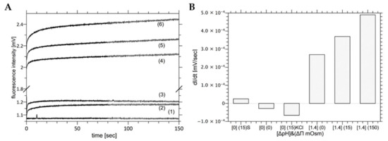 Figure 9. Panel (A) shows kinetics of fluorescence intensity changes caused by proton flow through liposome membrane exposed to different osmotic pressure differences at ΔpH = 1.4. Curve 4 represents the curve for Δπ = 0, Curve 5 for Δπ = 15 mOsm, and Curve 6 for Δπ = 150 mOsm. Curve 1 shows the fluorescence intensity when neither of gradients was present (ΔpH = 0 and Δπ = 0). Curves 2 and 3 represent the case when at ΔpH = 0 and Δπ = 15 mOsm. Curves 2 and 3 were generated with KCl or sucrose as osmotically active ingredients, respectively. Panel (B) shows slopes of the linear part of kinetics presented in panel A as a function of the osmotic pressure difference and/or pH.