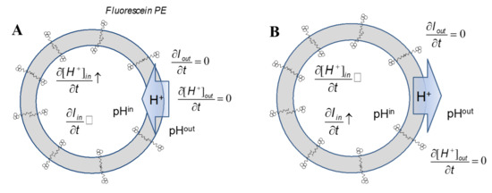 Figure 10. The drawing demonstrates an experimental design for proton transfer measurements using fluorescein-PE. In general, higher proton inner concentration (lower pH—panel B) will result in proton efflux and the decrease of the fluorescein intensity, while the lower proton inner concentration (higher pH—panel A) outcomes with the fluorescence increase.