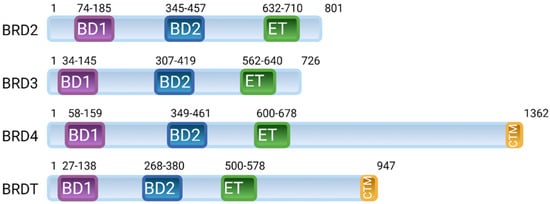 The bromodomain and extraterminal domain (BET) family belongs to BRD proteins and comprises four evolutionarily conserved members, including ubiquitously expressed BRD2, BRD3 and BRD4 and a testis-specific BRDT [,]. The BET family is characterised by the presence of two N-terminal bromodomains, BD1 and BD2, and an extraterminal domain (ET) (Figure 1) [,,]. BRD4 and BRDT also contain a C-terminal motif (CTM) that facilitates the recruitment of transcriptional regulators, including the positive transcription elongation factor (P-TEFb). Among these domains, BD1 and BD2 have a conserved sequence of 110 amino acids that creates a hydrophobic binding pocket for acetylated lysine residues on histones and other proteins [,]. BD domains are composed of a four-helix bundle (αZ, αA, αB and αC) and two loops, ZA and BC. The ET domain is a conserved region of ~80 amino acids that recruits transcription effector proteins [,,,]. The CTD domain is a conserved region of ~40 amino acids responsible for the recruitment of P-TEFb [,].