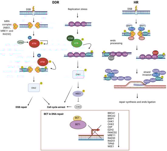 A drug combination screen of 20 well-characterised drugs targeting seven classes of epigenetic regulators identified a strong synergy between BETis and PARP inhibitors (PARPis) []. PARPis have been extensively used to evoke synthetic lethality in cells with inefficient HR, primarily due to germline loss-of-function mutations in either BRCA1 or BRCA2 in breast, ovarian, prostate and pancreatic cancers [,]. PARPis target PARP1 and PARP2, which are necessary sensors of DNA damage that recognise single-stranded breaks (SSBs) and transduce the signal in the DDR pathway. Mechanistically, blocking PARP1’s enzymatic activity compromises the repair of SSBs, which become converted to double-stranded breaks (DSBs) during DNA replication, thus inducing synthetic lethality in cancer cells with deficient HR. BETis caused epigenetic loss of BRCA1 expression in BRCA1 wild-type TNBC cells and synergised with PARPis impairing HR and thus triggering synthetic lethality []. The independence from intrinsic HR status is consistent with the BETi-induced deficiency in HR. Simultaneous inhibition of BET and PARP could expand the spectrum of cancer types qualifying for PARPi treatment beyond those with deficient HR [,,].