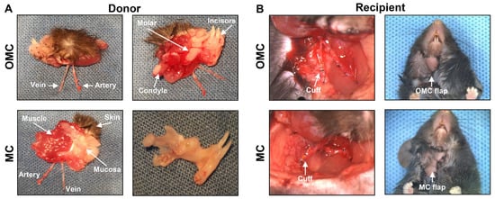 We established the mouse hemiface transplant model, which comprises the skin, muscle, mandible, oral mucosa, and vessels and can be used for VCA studies [32]. The placement of the transplanted hemiface on the neck can reduce the risk of autonomy (mice biting an insensate flap) and increase surgery success. The cuff technique was utilized for vessel anastomosis [60,61]. To further understand the effects of the mandible on facial allograft survival, we removed the mandible from a whole hemiface subunit, including the skin, muscle, mandible, teeth, oral mucosa, and vessels, in the MC group, compared to the OMC group with the whole hemiface (Figure 1A). Representative charts of donor and recipient surgeries in the two groups are shown in Figure 1.