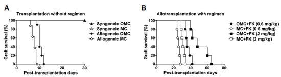 Survival of the facial flaps in the osteomyocutaneous (OMC) and myocutaneous (MC) allograft groups. (A) The survival rate of facial allografts in the OMC and MC graft groups without an immunosuppressive regimen. Fully major histocompatibility complex-incompatible BALB/c allografts were grafted onto the necks of C57BL/6 mice. The syngeneic group had facial grafts from C57BL/6 mice. The syngeneic OMC, syngeneic MC, allogeneic OMC, and allogeneic MC groups included a total of nine, six, ten, and eight mice, respectively. The Kaplan–Meier method was utilized to calculate the survival rate. The differences between the allogeneic OMC and MC groups were significant (p < 0.005). (B) Survival rate of facial flaps in the OMC and MC allograft groups with an immunosuppressive regimen. Two dosages of FK506 (0.6 and 2 mg/kg) were administered to transplanted mice via intraperitoneal injection for 21 days. The allogeneic OMC and MC groups receiving 0.6 mg/kg of FK506 had a total of five mice each. FK shown in (B) is the FK506 abbreviation. The allogeneic OMC and MC groups receiving 2 mg/kg of FK506 also had a total of five mice each. The differences between allogeneic OMC and MC groups for both dosages were significant (p < 0.005).