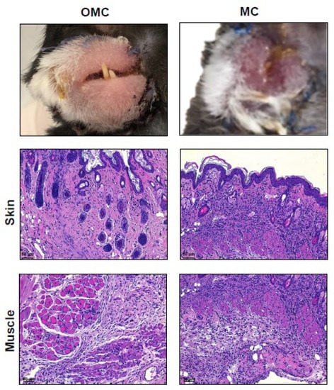Degree of lymphocyte infiltration into facial allograft. Macroscopic and histological changes (indicated by hematoxylin and eosin staining) in facial allografts of osteomyocutaneous (OMC) and myocutaneous (MC) groups receiving 0.6 mg/kg of FK506 on postoperative day (POD) 14. Dense violet staining demonstrates infiltrating lymphocytes in the skin and muscle layers of the facial allograft. Scale bars are 50 μm.