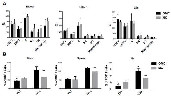 To further evaluate the effects of the mandible on alloimmune responses in hemiface allotransplanted mice, we analyzed cytokine-producing CD4+ T cells using flow cytometry. Cytokines can be divided into two groups: pro-inflammatory and anti-inflammatory. Different T cell subsets possess different unique properties and functions [63,64]. Pro-inflammatory IFN-γ cytokine-producing T helper 1 (Th1) and anti-inflammatory cytokine-producing regulatory T cells (Tregs) were examined. The allo-OMC group exhibited a significant decrease in Th1 cells in the blood and LNs, but showed a similar percentage of Th1 cells in the spleen, compared to the allo-MC group. Interestingly, the allo-OMC group displayed a significant increase in the percentage of Tregs in LNs and a slight increase in the percentage of these cells in the blood and spleen compared with the allo-MC group (Figure 4B). This finding suggests that the mandible is associated with the formation of anti-inflammatory immune responses.
