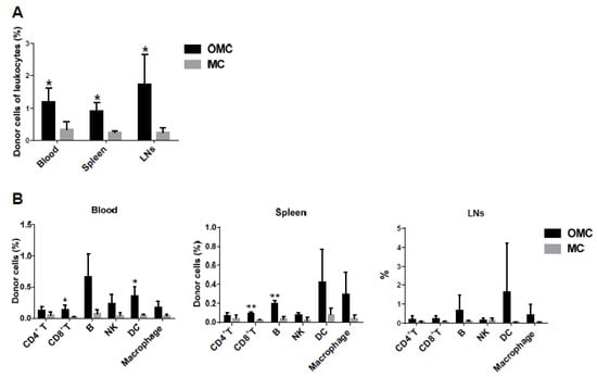 The induction of mixed chimerism was demonstrated to prolong allograft survival and even result in lifelong allograft tolerance in the host. It refers to the coexistence of donor and recipient immune cells. The mandible has been shown to possess bone marrow hematopoietic stem cells [34,35], which may differentiate into donor immune cells in the recipient. Thus, the allo-OMC group-mediated allograft survival may be correlated with the induction of mixed chimerism. To assess the levels of mixed chimerism in the hemiface-allotransplanted mice, donor immune cells were analyzed using flow cytometry. H2d antibody was used to distinguish donor cells from recipient cells because H2d class I histocompatibility antigen was restricted to the BALB/c donor cells. On POD 14, leucocytes were harvested from the blood, spleen, and LNs of both allogeneic groups. Significantly increased percentages of donor immune cells were seen in the blood, spleen, and LNs of the allo-OMC group compared with the allo-MC group (Figure 5A).