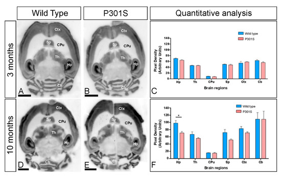 We first determined the GIRK2 expression in the brain of P301S mice and age-matched wild type mice at 3 and 10 months using a GIRK2 subunit-specific antibody in conventional histoblotting [23]. In wild type mice, GIRK2 immunolabelling was widely distributed in the brain at the two ages studied, with strong labelling in the hippocampus, neocortex, cerebellum, septum, and thalamus (Figure 1A,C,D,F). Moderate labelling was observed in midbrain nuclei, including the inferior and superior colliculus, and brainstem nuclei (Figure 1A,D). Faint labelling was observed in basal ganglia nuclei such as the caudate putamen (Figure 1A,C,D,F). Qualitatively, this brain expression pattern was similar in the brain of P301S mice (Figure 1B,E). Quantitatively, analyses carried out to compare the protein expression levels revealed that this expression pattern of the wild type was unchanged in the brain of P301S mice at 3 months (Figure 1C) but showed a significant decrease in labelling in the hippocampus at 10 months of age (Figure 1F).