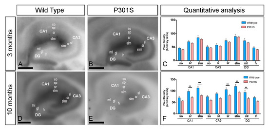Hippocampal expression of GIRK2 in the hippocampus of P301S mice. (A–F) The expression of the GIRK2 protein was visualised in histoblots of horizontal brain sections at 3 and 10 months of age in wild type and P301S mice using an affinity-purified anti-GIRK2 antibody. GIRK2 expression in different hippocampal subfields and dendritic layers was determined by densitometric analysis of the scanned histoblots (panels C and F). GIRK2 expression in the CA1 region was strong in the stratum lacunosum–moleculare (slm) and distal half of the stratum radiatum (sr) and moderate in the proximal half of the stratum radiatum and the stratum oriens (so). In the CA3 region, expression for GIRK2 was strong in the strata lucidum (sl), radiatum (sr), and lacunosum–moleculare (slm), and moderate in the stratum oriens (so). In the DG, GIRK2 expression was strong in the molecular layer (ml) and weak in the hilus (h). Densitometric analysis showed no differences in GIRK2 expression in between wild-type and P301S mice of 3 months, but significant reduction in some dendritic layers at 10 months (Multiple t-tests and Holm-Sidack method, ** p < 0.01; *** p < 0.001). Error bars indicate SEM. Abbreviations: CA1 region of the hippocampus; CA3, CA3 region of the hippocampus; DG, dentate gyrus; so, stratum oriens; sp, stratum pyramidale; sr, stratum radiatum; slm, stratum lacunosum-moleculare; ml, molecular layer; gl, granule cell layer; h, hilus. Scale bars: 0.05 cm.