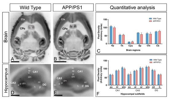 Regional expression of GIRK2 in the brain of APP/PS1 mice. (A–C) The regional brain expression was visualised in histoblots of horizontal brain sections at 12 months of age in wild type and APP/PS1 mice using an affinity-purified anti-GIRK2 antibody. The expression of GIRK2 revealed marked region-specific differences, with strongest immunoreactivity in the hippocampus (Hp), neocortex (Ctx), cerebellum (Cb), septum (Sp), and thalamus (Th) and weakest in the caudate putamen (CPu). Densitometric analysis showed no differences in GIRK2 expression in APP/PS1 mice compared to age-matched wild type controls. Error bars indicate SEM. (D–F) Hippocampal expression of GIRK2 in wild type and APP/PS1 mice visualised in histoblots of horizontal sections at 12 months of age. Expression for GIRK2 was strong in all dendritic layers of the CA1 and CA3 region and DG, with the strata lacunosum–moleculare (slm) and radiatum (sr) of the CA1 and CA3 regions and molecular layer (mL) of the DG showing the highest expression levels. A moderate expression was observed in the stratum oriens (so) of CA1 and CA3, and the stratum lucidum (sl) of CA3. The hilus (h) of the DG showed the lowest GIRK2 expression level in this region. Densitometric analysis showed no differences in GIRK2 expression in the hippocampal dendritic layers of APP/PS1 mice compared to age-matched wild type controls. Error bars indicate SEM. Abbreviations: CA1 region of the hippocampus; CA3, CA3 region of the hippocampus; DG, dentate gyrus; so, stratum oriens; sp, stratum pyramidale; sr, stratum radiatum; slm, stratum lacunosum-moleculare; ml, molecular layer; gl, granule cell layer; h, hilus. Scale bars: (A,B): 0.2 cm; (D,E): 0.05 cm.