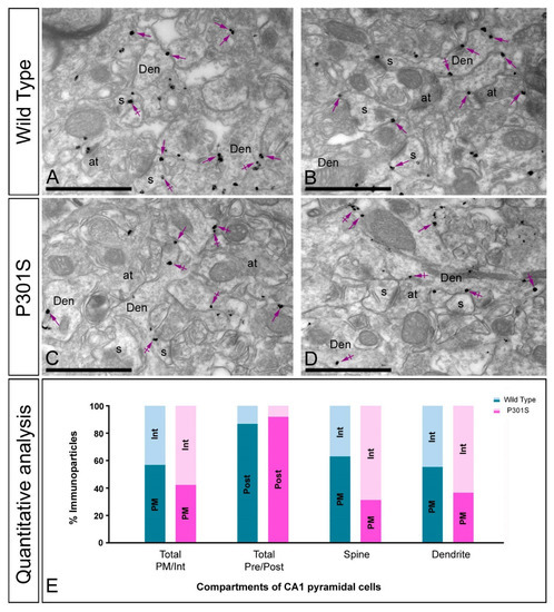 Immunohistochemical reactions at the electron microscopic level were carried out using the pre-embedding immunogold as described earlier [56]. Briefly, free-floating sections obtained from wild type and P301S mice at 10 months, and from wild type and APP/PS1 mice at 12 months, were incubated in parallel in 10% (v/v) NGS diluted in TBS. Sections were then incubated in anti-GIRK2 antibodies (3–5 μg/mL diluted in TBS containing 1% (v/v) NGS), followed by incubation in goat anti-guinea pig IgG coupled to 1.4 nm gold (Nanoprobes Inc., Stony Brook, NY, USA). Sections were postfixed in 1% (v/v) glutaraldehyde and washed in double-distilled water, followed by silver enhancement of the gold particles with an HQ Silver kit (Nanoprobes Inc.). Sections were then treated with osmium tetraoxide (1% in 0.1 M phosphate buffer), block-stained with uranyl acetate, dehydrated in graded series of ethanol and flat-embedded on glass slides in Durcupan (Sigma-Aldrich, St. Louis, MO, USA) resin. Regions of interest were cut at 70–90 nm on an ultramicrotome (Reichert Ultracut E, Leica, Vienna, Austria) and collected on single slot pioloform-coated copper grids. Staining was performed on drops of 1% aqueous uranyl acetate followed by Reynolds’s lead citrate. Ultrastructural analyses were performed in a JEOL-1400Flash electron microscope (Jeol Ltd., Tokyo, Japan).