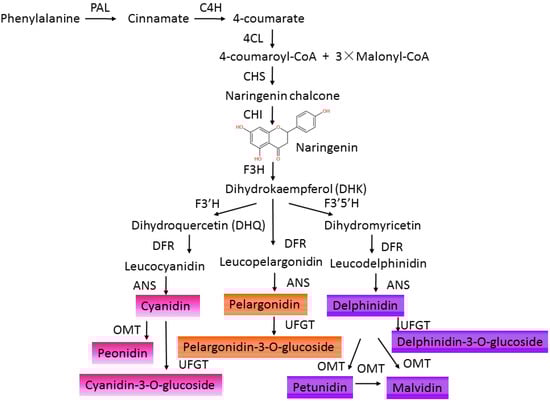 In the natural environment, anthocyanins participate in the formation of multicolors in fruits, flowers, leaves, even roots of plants [,]. Different kinds of anthocyanins modified by methylation and hydroxylation at different positions of C6-C3-C6 carbon skeleton structures decide different colors varying from orange, red, and purple to blue in plants [,] (Table 1). The physiological role of anthocyanin in plants consists of defending against viral, bacterial, and fungicidal activities, absorbing excess visible and UV light irradiance, attracting pollinators and seed dispersers, and scavenging excess ROS under abiotic stresses [,,]. Anthocyanins are synthesized in the endoplasmic reticulum and transported to accumulate in the vacuoles of a wide range of cells and tissues in both the vegetative and reproductive organs of plants []. The synthesis of anthocyanins in plants is controlled by structural genes and can be divided into four stages [,]. The early stage is from phenylalanine to 4-coumaryl CoA sequentially catalyzed by phenylalanine ammonialyase (PAL), cinnamate 4-hydroxylase (C4H), and 4-coumarate-CoA ligase (4CL). Then, 4-coumaroyl CoA is converted to dihydrokaempferol (DHK), which is regulated by chalcone synthase (CHS), chalcone isomerase (CHI), and flavanone 3-hydroxylase (F3H). DHK can also be converted to dihydroquercetin (DHQ) by flavonoid 3′-hydroxylase (F3′H) or catalyzed by flavonoid 3′5′-hydroxylase (F3′5′H) to form dihydromyricetin. Next, DHK, DHQ, and dihydromyricetin are separately converted to leucopelargonidin, leucocyanidin, and leucodelphinidin by dihydroflavonol 4-reductase (DFR). Finally, these leucoanthocyanidins are catalyzed by anthocyanidin synthase/leucoanthocyanidin dioxygenase (ANS/LDOX) to form colored anthocyanidins (pelargonidin, cyanidin, delphinidin) []. Then, these anthocyanidins can be further modified by UDP-glucose flavonoid glucosyltransferase (UFGT), acetylase, O-methyltransferase (OMT), and anthocyanin transferase (AT) [] to produce stable and water-soluble pigments (Figure 1). These flavonoid products vary in different plants due to the evolution of anthocyanin metabolism under environmental selective pressures []. Anthocyanins show potent antioxidant activities and are effective scavengers of ROS in vitro [,]. In addition, anthocyanins are involved in regulating ROS-induced signaling responding to environmental cues [,,]. Anthocyanins may be regulators of the ROS-signaling network due to their ability to interact with protein and to enhance the activity of protein through the ROS reaction [,,]. However, the functional roles of flavonoids in plants remain indistinct not only for their numerous varieties, but also for their different influences in different plant species. According to different properties of solubility, light absorption, and distribution patterns in various parts of the plant, anthocyanins have been cataloged numerically [], and the composition profile of anthocyanins varied under different stresses [,]. The biological functions of different types of anthocyanins still need to be identified in various plants. Moreover, the roles of family genes, encoded enzymes of the anthocyanin biosynthetic pathway, also need to be clarified [,,].