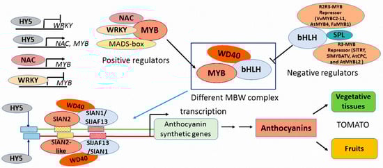 The regulatory pathway of anthocyanin biosynthesis in plants. NAC, WRKY, MADS-box can interact with MYB to form BMW complex and positively regulate the expression of anthocyanin synthetic genes. In the regulatory pathway, the expression of NAC, MYB is regulated by HY5, NAC, and WRKY, and the expression of WRKY is also regulated by HY5. However, some negative regulators such as VvMYBC2-L1, AtMYB4, FaMYB1 belonging to R2R3-MYBs, SlTRY, SlMYBATV, AtCPC, and AtMYBL2 belonging to R3-MYBs interact with bHLH to compete with MYB and disturb the MBW complex. Another negative regulator SPL can also interact with bHLH to affect MYB-bHLH-WD40 complex. The transcription factor HY5 and MBW complex which consists of different MYB proteins such as SlAN2 and SlAN2-like and bHLH proteins such as SlAN1 and SlJAF13 in tomato can bind to the promoters of different anthocyanin synthetic genes to activate their transcription and accumulate anthocyanin in specific vegetative tissue or fruits.