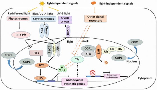 A simplified model of light-dependent and -independent regulation of anthocyanin biosynthesis in plants. During light-dependent anthocyanin biosynthesis, photoreceptors sense different wavelengths of light and are activated to be transferred into the nucleus, then the HY5-COP1-SPA complex is rearranged to dissociate HY5 protein and to avoid the degradation of HY5 transcription factors. HY5 positively regulates the expression of anthocyanin biosynthetic genes and lead to pigment accumulation. During light-independent anthocyanin biosynthesis, positive or negative transcription factors are activated or suppressed to form an MBW complex regulating the expression of anthocyanin biosynthetic genes.