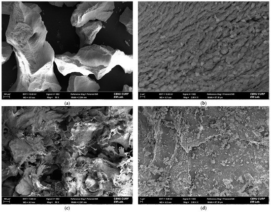 Field emission scanning electron microscope images of each bovine bone scaffold: Particle bovine bone scaffold ((a,b); original magnification 50×, 2000×, respectively), Block bovine bone scaffold ((c,d); original magnification 50×, 2000×, respectively).