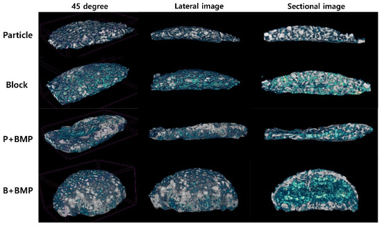 Three-dimensional (3D) reconstruction images of μ-CT images are shown in Figure 2. The grafted bone scaffold was observed on the surface of the calvarial bone in all groups 6 weeks after surgery. The particle and block groups retained their original appearance as bone scaffolds without significant changes. The P (particle)+BMP and B (block)+BMP groups showed new bone formation and mineralization on the outer surface of the grafted bone scaffold. Newly formed bone was observed inside the bone scaffold in the block, P+BMP, and B+BMP groups on the section image.
