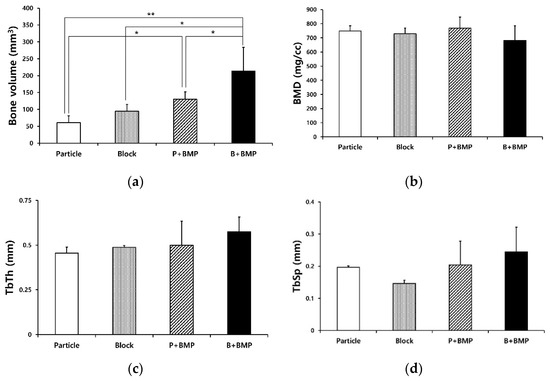 Micro-computed tomography analysis: (a) Bone volume (BV), (b) Bone mineral density (BMD), (c) Trabecular thickness (TbTh), and (d) Trabecular spacing (TbSp) of the the particle (P), block (B), P+ bone morphogenetic protein (BMP), and B+BMP groups. Significant differences were observed in the BV values (* p < 0.05, ** p < 0.001).