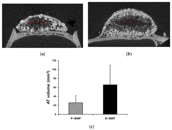 Micro-computed tomography images and volumes of the adipose tissue (AT) in the particle (P)+ bone morphogenetic protein (BMP) and block (B)+BMP groups. (a) Void space formation in the P+BMP group, (b) vacant space in the central area of the bone scaffold in the B+BMP group. (c) The average AT volumes of the P+BMP and B+BMP groups were 25.87 ± 16.03 and 65.81 ± 43.65 mm3 (p = 0.063). Red asterisks = adipose tissue.