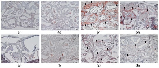Immunohistochemical staining of bone sialoprotein (BSP) and osteocalcin observed in each group. (BSP; a–d) and osteocalcin (e–h) at 6 weeks after the operation. (a,e) particle (P), (b,f) block (B), (c,g) P+bone morphogenetic protein (BMP), and (d,h) B+BMP. A high expression of BSP and osteocalcin was observed in the new bone matrix of the P+BMP and B+BMP groups and is indicated by black arrows (Original magnification 100×, bar = 100 µm).