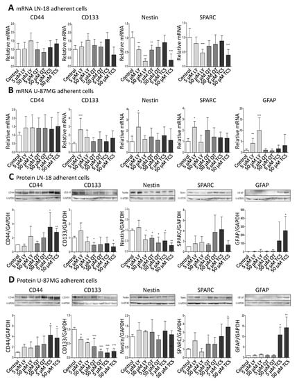 - Liu, G.; Yuan, X. Analysis of gene expression and chemoresistance of CD133+ cancer stem cells in glioblastoma. Mol. Cancer 2006, 5, 67–75. [Google Scholar] [CrossRef]