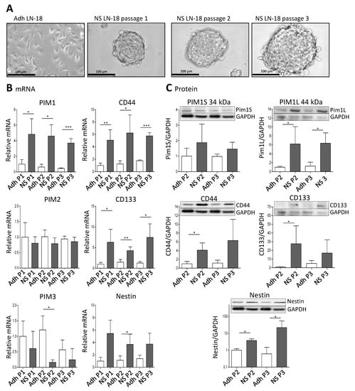 2.3. Expression of PIM1 and Stem Cell Markers in Stem-like LN-18 Neurospheres