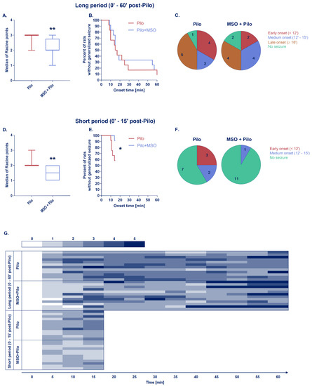 Figure 1. Box charts show the averaged magnitudes of seizures presented as a median of Racine points over a long period (A) or short period of observation (D), ** p < 0.01, Mann–Whitney test; survival plots show latency to the onset of the first generalized seizure among each group (B,E), * p < 0.05, Gehan–Breslow–Wilcoxon test; pie charts present the onset periods of the first generalized seizure—colors indicate distinct periods, numbers represent quantity of animals in each onset period (C,F); heat map shows detailed seizure dynamic for each animal in Racine scale (G); Pilo, MSO+Pilo N = 12 for both time periods.