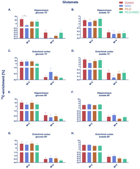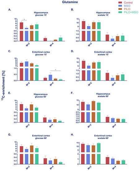 Figure 3. Percentage of 13C-enrichment in glutamine derived from [U-13C]glucose (A,C,E,G) or [1,2-13C]acetate (B,D,F,H) in the hippocampus and entorhinal cortex of TLE model rats. * p < 0.05, one-way ANOVA with Tukey’s correction; Control, MSO, Pilo, MSO+Pilo N = 6; mean ± SEM. Designations “15” and “60” refer to the short (AD) and long period (EH) of Pilo action and correspond to 150–165 min or 195–210 min time of action of MSO, respectively, rendering in each case a 15 min presence of the isotope in the body.