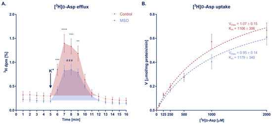 Figure 4. (A) [3H]d-Asp efflux from brain slices of rats that received MSO or vehicle (control group). Arrow indicates the moment when K+ depolarizing pulse was introduced. **, ***, **** p < 0.01, 0.001, 0.0001 respectively; #—statistical significance between areas under curve (AUC), one-tailed t-test; baseline for AUC comparison was set as a mean of fractions 1–5; baselines were compared using linear regression but changes between the slopes were not significant; control N = 5, MSO N = 6; mean ± SEM. (B) [3H]d-Asp uptake from brain slices of rats that received MSO or vehicle (control group). The dashed lines represent Michaelis–Menten kinetic curves; Vmax and Km constants were compared using t-test; control, MSO N = 7; mean ± SEM.