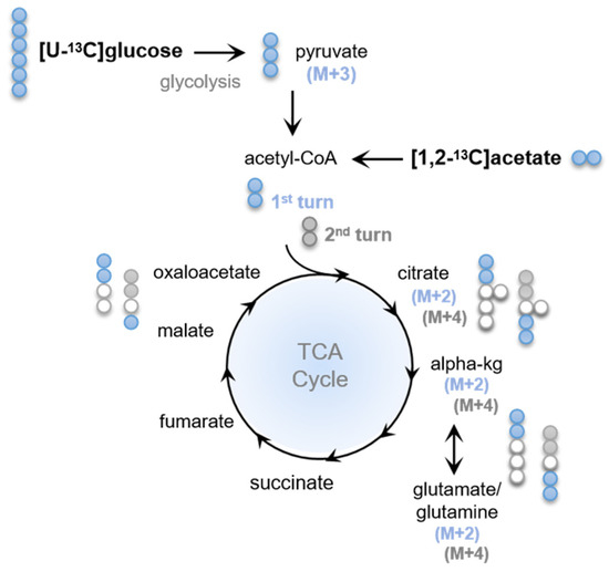 The following procedures were based on previously published papers [33,73]. The main labelling patterns of the metabolites from [U-13C]glucose or [1,2-13C]acetate in the experimental setting of the present investigation are detailed in Scheme 1.