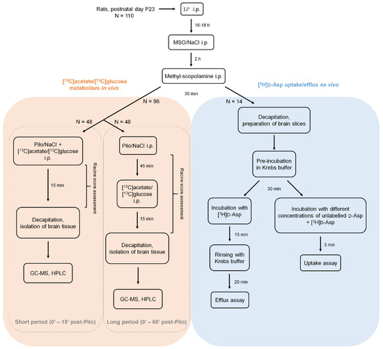 Scheme 2. A diagram of the in vivo and ex vivo experiments in the Li-Pilo model. Male Sprague Dawley rats were administered sequentially with lithium, MSO or saline and methyl-scopolamine, starting at postnatal day 23 (P23). Afterwards, animals intended for metabolic experiments (left, orange panel) received a dose of a convulsive agent–pilocarpine or saline and were observed for 15 (short period groups) or 60 min (long period groups) and then decapitated. All rats in in vivo experiments were also injected with 13C-labelled metabolic precursor (acetate or glucose), 15 min prior to decapitation. Dissected brain tissue was homogenized and analyzed with gas chromatography coupled to mass spectrometry (GC-MS) and high performance liquid chromatography (HPLC). Animals intended for ex vivo experiments with 3H-labelled Glu surrogate, d-aspartate ([3H]d-Asp) (right, blue panel) were decapitated 30 min after methyl-scopolamine injection, the brain was isolated and immediately cut into slices. Acute brain slices were pre-incubated in Krebs buffer for 30 min, then incubated with [3H]d-Asp and subjected to efflux or uptake assays. In the metabolic studies (orange panel), a total of 96 animals were used: 6 animals in each group (Control, MSO, Pilo, MSO+Pilo): 6 × 4 groups × 2 13C-precursors × 2 settings (long and short period). A total of 14 animals were used in the uptake/efflux experiments (blue panel).