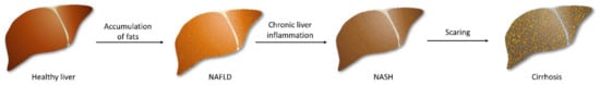 NAFLD is characterized by lipid accumulation in hepatocytes and abnormal liver enzyme levels. Steatosis is diagnosed when at least 5% of liver cells contain excess fat [11], particularly in people who do not drink alcohol or limit their consumption to 30 g of alcohol (men) and 20 g (women) per day [12]. Furthermore, about one-fifth of NAFLD patients will develop NASH as a result of chronic liver inflammation [13], characterized by hepatocellular injury and the characteristic ballooning of hepatocytes [14]. Small lesions could easily be regenerated by the liver, but prolonged inflammation causes fibrosis, resulting in scarring of the liver, which can lead to cirrhosis and liver failure. Unfortunately, progressive lesions are also able to trigger hepatocellular carcinoma (Figure 1) [15].