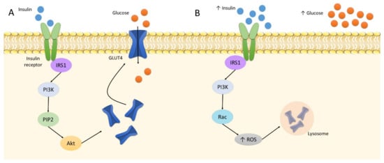 Oxidative stress is related to the etiology of IR. In its physiological state, insulin binds to the insulin receptor to phosphorylate IRS1. This triggers the phosphorylation of PI3 kinases and subsequent PIP2. The cascade activates the Akt pathway [107]. It is followed by the translocation of GLUT4 to the plasma membrane in tissues sensitive to insulin, i.e., adipocytes and skeletal muscles. It increases the cellular absorption of glucose and reduces its concentration in the blood [108]. Insulin elevates GLUT4 expression to increase glucose uptake; however, at increased insulin levels, GLUT4 is downregulated. Four-hour treatment of 1 nM insulin on 3T3-L1 adipocytes was found to decrease the protein level of GLUT4 by approximately 20% [109]. Following this downregulation and the buildup of glucose in the bloodstream, the pancreas produces more insulin due to the positive feedback loop; as a result, the cells become insulin resistant, i.e., insensitive to insulin. In such cases, GLUT4 demonstrates continually lower expression, which results in hyperinsulinemia, hyperglycemia, and increased oxidative stress, leading directly to inflammation [7,109]. In addition, a higher insulin level also alters the action of PI3, which phosphorylates Rac instead of PIP2, and, thus, activates NADPH oxidase 4, producing large amounts of ROS [110]. This involves the activation of the retromer, i.e., a group of proteins engaged in endosomal transport; as a result, GLUT4 is transported to lysosomes for degradation and cannot perform its function (Figure 2) [7].