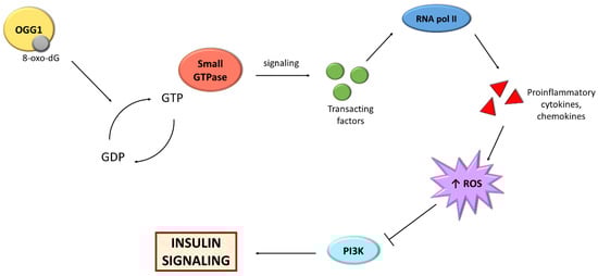 Scheme presenting the relationship between BER and insulin signaling. Abbreviations: GDP: guanosine diphosphate; GTP: guanosine triphosphate; OGG1: oxoguanine glycosylase; PI3K: phosphoinositide 3-kinase; RNA pol II: RNA polymerase II; ROS; reactive oxygen species.