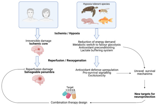 How tolerant species keep their neurons alive after days of hypoxia, an astonishing natural capacity acquired throughout evolution, is not fully understood. Results from animal studies suggest that neuroprotective agents can prevent brain damage and neurological deficits after experimental brain ischemia. In this sense, different neuroprotective approaches targeting known molecular pathways used by tolerant animals have resulted in positive outcomes in preclinical stroke models. Unfortunately, all drugs tested in preclinical studies have systematically failed to translate in human ischemia. Understanding the mechanisms that operate simultaneously in tolerant animals to grant them survive hypoxia without neurological damage may yield different insights to propose new neuroprotective combination therapies for stroke that overcome the failure of individual treatments (Figure 1).