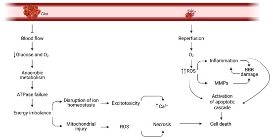 The insufficient supply of oxygen and glucose to the brain cells generates a complex cascade of pathological events (Figure 2). First, the mitochondrial oxidative phosphorylation is disrupted and, therefore, ATP synthesis is decreased and energy stores quickly deplete. Anaerobic glycolysis is not enough to cover the cellular needs and the accumulation of lactate as an end-product triggers tissue acidosis. The immediate consequence of the energy shortage is the failure of ATPases to work properly and consequently ion imbalance. At this point, neurons depolarize and the entrance of calcium results in the activation of catabolic and cell death pathways but also in the release of excessive amounts of excitatory neurotransmitters [8]. Moreover, dysregulation of Na+/K+ exchange increases intracellular sodium concentration that can lead to cellular edema [6]. Glutamate, the main excitatory neurotransmitter, further exacerbates Ca2+, K+ and Na+ influx and the downstream signaling cascade. Calcium overload activates calcium-dependent enzymes (lipases, phosphatases, and endonucleases) that cause membrane disruption, DNA damage and Reactive Oxygen Species (ROS) production [9]. The extent and mechanism of cell death is dependent on the duration and grade of blood flow reduction. At the ischemic core, cells quickly undergo necrosis and the damage spread towards the periphery causing delayed cell death by apoptosis at the penumbra area [10]. Restoration of blood flow represents, paradoxically, another source of cell injury by providing oxygen that can be used for ROS production in a way that exceeds the capacity of the antioxidant defenses and directly damage lipids, proteins, nucleic acids, and carbohydrates, and participate in signalling pathways that can promote cell death programs [11]. ROS and Ca2+ accumulation promote the synthesis of pro-inflammatory mediators and endothelial cell adhesion molecules as well as activate matrix metalloproteinase (MMPs). This phenomenon disrupts the integrity of the vascular blood brain barrier (BBB) and helps immune cells to migrate and infiltrate the brain parenchyma, which contributes to the inflammatory response initiated a few hours after anoxia [1]. The mentioned pathophysiological processes appear at different time points after ischemia. However, they are not independent to each other, but overlap over the time and share molecular features.