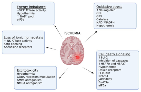 When ATP level falls below 80%, intracellular ATP-dependent activities, such as protein folding, proteasomal degradation and autophagy, terminate or slow down. Protein misfolding, aggregation and destruction of organelles contribute to hypoxic-ischemic brain injury pathology [138]. HSP is a family of molecular chaperones synthesized in response to stress that participate in proteostasis. It has been shown that overexpression of Hsp70 and Hsp27 plays a part in ischemic tolerance induced by preconditioning [139]. Different studies reported reduced apoptotic and infarcted area in ischemic brains after viral overexpression or recombinant protein administration of both Hsp70 [87,89] and Hsp27 [90,91,140]. Moreover, administration of Hsp90 ligands, which results in increased transcription of chaperones, ameliorated brain edema, inflammation and neurobehavioral deficits after experimental models of subarachnoid hemorrhage (SAH) [141] as well as MCAO [88].