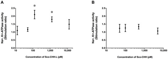 In vitro effects of Sco-CHH-L and Sco-CHH on the Na +, K +-ATPase activity in posterior gills of the mud crab Scylla olivacea. The posterior gills (gill 6) were dissected and received perfusion of (A) Sco-CHH-L (12.5, 50.0, 125.0, 1250.0, and 10,000 pM) or (B) Sco-CHH (50.0, 100.0, 500.0, and 5000.0 pM). Data are means ± SEM and expressed as the stimulation ratio. n = 4 for each treatment. The asterisk (*) indicates significantly different from vehicle control (saline treatment) at 5% level.