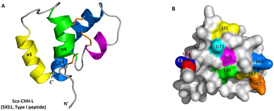 Structure of Sco-CHH-L was compared and contrasted with those of two other CHH-superfamily peptides, namely, Pej-MIH and Pej-SGP-I-Gly [25,26]. The six invariant cysteine residues with a unique disulfide bridge connectivity (C1-C5, C2-C4, and C3-C6, Figure 3) is a signature of the superfamily that shapes the overall fold of the peptides [11]. The common core of all three of the structures is composed of three helices, α2, α3, and α4 (π4, in Sco-CHH-L), that have similar topological relationships, with α2 and α3 running in anti-parallel direction and α4 (π4) running orthogonally (Pej-SGP-I-Gly) or obliquely (Pej-MIH and Sco-CHH-L) to α2/α3 (Figure 2). Three aromatic residues in the hydrophobic core of a venom toxin (Ta1a), a venom peptide of the CHH-superfamily, have been suggested to play a role in the packing of the structure [10]. The three aromatic residues are conserved in the Pej-MIH and Sco-CHH-L, respectively as Tyr17, Phe45, Phe50, and Phe16, Phe44, and Phe49, and only the second (Tyr44) and third (Phe49) aromatic residues are present in SGP-I-Gly (Figure 3). It appears that for these peptides, only the second and third aromatic residues, being buried in the hydrophobic core, are involved in the packing of the structure, while the side chain of the first conserved residue (in Pej-MIH and Sco-CHH-L) is lying on the surface of the structure (Figure 4). There are other hydrophobic residues that are conserved across the CHH-superfamily peptides and have been suggested to stabilize the structure (Figure 3) [11,25]; among those residues, only Ile15, Val35, and Val53 are located inside the Sco-CHH-L structure and likely contribute to the stabilization of the structure.