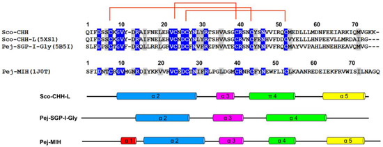 Sequence alignment and secondary structure of four CHH/ITP peptides. Sequence alignment and secondary structure of four CHH-superfamily peptides. Amino acid sequences of the mature peptide of three Type-I peptides, Sco-CHH, Sco-CHH-L, and Pej-SGP-I-Gly, and that of a Type-II peptide, Pej-MIH, are aligned. Accession number for the amino acid sequence is, respectively AY372181, EF530127, AB007507, and P55847. For Sco-CHH-L, Pej-SGP-I-Gly, and Pej-MIH, location of the secondary structures is given. The conserved pattern of disulfide bridge connectivity (Cys7–Cys43/44, Cys23/24–Cys39/40, and Cys26/27–Cys52/53) is indicated by orange lines.