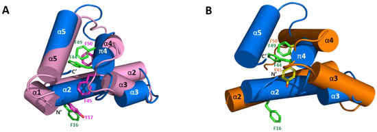 Superposition of Sco-CHH-L with Pej-MIH and Pej-SGP-I-Gly. Structure of Sco-CHH-L (blue) is superposed with (A) Pej-MIH (pink) and with (B) Pej-SGP-I-Gly (orange). Note that Sco-CHH-L is well aligned with Pej-MIH with the N- and C-terminus being brought near together, while the two termini of Pej-MIH are kept away in Pej-SGP-I-Gly. Side chains of the conserved aromatic residues in Sco-CHH-L (Phe16, Phe44, and Phe49 in green), MIH (Tyr17, Phe45, and Phe50 in magenta), and Pej-SGP-I-Gly (Tyr45 and Phe50 in yellow) are shown. Note the aromatic ring of Phe16/Tyr17 pointing away from the core structure.