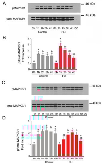During the long-term culture, the increased activity of MAPK3/1 in COCs cultured in the control medium was detected at 4 h, reached its maximum at 16 h and remained stable by the end of culture at 40 h. In concert with the data obtained during the short-term culture, the significantly increased activity of MAPK3/1 was first detected in the COCs cultured in FLI medium at 8 h of culture, reached maximum at 16 h of culture, remained high at 24 h and dropped at 40 h of culture, when it was significantly lower than in COCs cultured in control medium. There was no difference in the relative increase in MAPK3/1 phosphorylation between the control and FLI medium until 24 h of culture (Figure 1C,D).