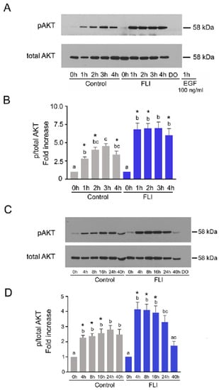 Time course of AKT activation in COCs culture in control and FLI medium. Activation of AKT in control and FLI medium during short-term (A) or long-term (C) culture. The panels show representative results of immunoblotting of phosphorylated and total AKT in samples of 25 COCs cultured in vitro for the indicated periods of time. Denuded oocytes (DO) cultured for 4 or 40 h were used for assessing their contribution to the entire COC signal. Quantification of the activated AKT in three independent experiments was performed by densitometry and is shown in the graphs as proportions of phosphorylated and total AKT, and expressed in arbitrary units as the fold increase over the proportion found in unstimulated COCs at the beginning of the culture (B,D). The different superscripts or superscripts with no common letter above the columns indicate significant differences within the same treatment. The asterisks above the columns indicate a significant difference between the treatments at the same time of culture (p < 0.05).