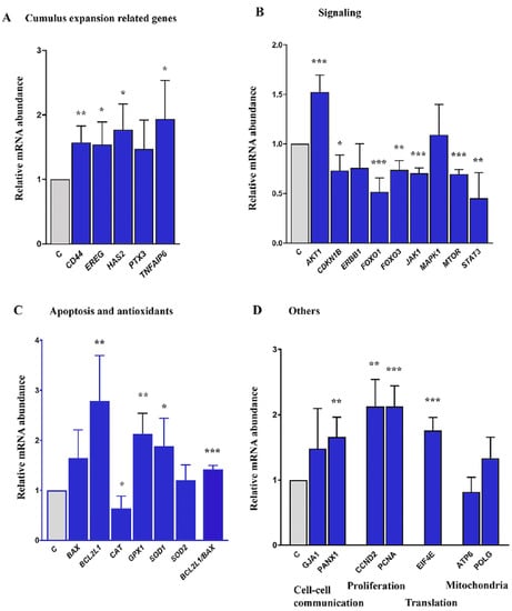 Gene expression in cumulus cells (CCs) cultured in control and FLI medium. Cumulus expansion-related genes (A), signaling pathways-related genes (B), genes related to apoptosis and antioxidants (C), and others (D). Differences are expressed in arbitrary units as the fold increase over the proportion found in CCs cultured in control (C). Asterisks above the columns indicate significant differences between the treatments at the same time of culture (p < 0.05 for single asterisk; p < 0.01 for double asterisk, p < 0.001 for triple asterisk).