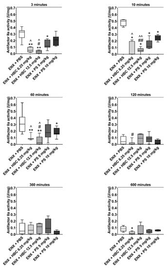 Ninety male and ninety female BALB/c mice were randomly assigned to thirty groups. Female body weight was 19.8 ± 2.4 g, whereas male body weight was 25.4 ± 3.4 g. ENX (5 mg/kg, 4 mL/kg) was administered subcutaneously in bolus. After 110 min, vehicle (PBS), HBC (6.25 or 12.5 mg/kg, 4 mL/kg) or PS (5 or 10 mg/kg, 4 mL/kg) were administered into the tail vein. Lidocaine spray was used for reducing pain. All animals were anaesthetized with a mixture of isoflurane and oxygen (3% v/v), and placed in the anesthetic induction chamber, equipped with an individual mask providing a mixture of isoflurane and oxygen (1.5–2% v/v). The blood from the heart was collected after 3, 10, 60, 120, 360, and 600 min after PBS, HBC, or PS administration (6 mice per time point). Samples were collected in tubes containing trisodium citrate in a volume ratio of 9:1, centrifuged at 3500× g at 4 °C for 20 min, and plasma was deep-frozen (−80 °C) until further assays could be performed. The neutralization of ENX was analyzed by measuring antifactor Xa and antifactor IIa activity in a 96-well plate reader (Synergy HTX, BioTek, Winooski, VT, USA), according to the kit manufacturer instructions (BioMedica Diagnostics, Windsor, NS, Canada), modified as described previously [].