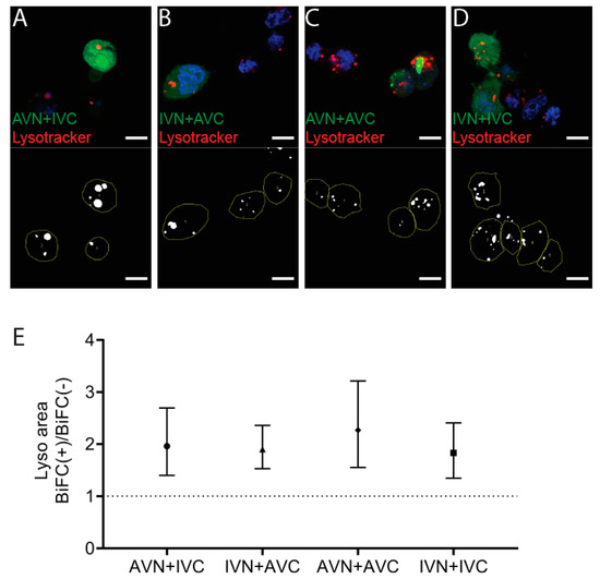 Expression of Aβ, IAPP, and Aβ + IAPP increase the lysosomal area. Confocal images of HEK293 cells transfected with (A) AVN + IVC, (B) IVN + AVC, (C) AVN + AVC, and (D) IVN + IVC stained with Lysotracker (red) and DAPI (blue). Below are the corresponding binary images displaying the cell area (yellow circle) and lysosomal area (white). (E) The ratio of the lysosomal area in BiFC(+)/BiFC(−) cells of AVN + IVC, IVN + AVC, AVN + AVC, and IVN + IVC-transfected cells. Scale bar: 10 µm. The results were analyzed by the method of EC Fieller and presented as the mean with a 95% confidence interval.