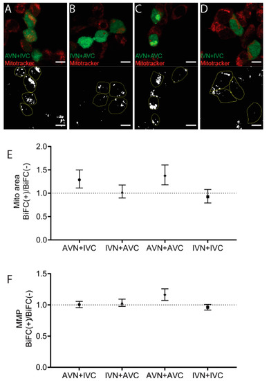Mitotracker was used to identify mitochondria 48 h post-transfection with AVN + IVC, IVN + AVC, AVN + AVC, and IVN + IVC (Figure 4A–D). This cationic probe containing a thiol-reactive chloromethyl moiety enters functional mitochondria and becomes fluorescent upon oxidization. The mitochondrial area per cell area increased in BiFC-positive cells transfected with AVN + IVC to 8.8%, compared to 6.8% in the control cells (p < 0.001) and after transfection with IVN + AVC, the area increased to 10% in BiFC-positive cells compared to 9.8% in untransfected cells (ns). Following transfection, with AVN + AVC, the area increased to 10.4% in BiFC-positive cells compared to 7.6% in the control cells (p < 0.0001). After transfection with IVN + IVC, the mitochondrial area was determined up to 9.1% in BiFC-positive cells and to 9.9% in the control cells (ns). When comparing the BiFC(+)/BiFC(−) ratios (Figure 4E), an increase in the mitochondrial area occurred after transfection with AVN + IVC and AVN + AVC, while, in cells transfected with IVN + AVC, the mitochondrial area was unchanged. In cells transfected with IVN + IVC, a slight decrease in the mitochondrial area of BiFC-positive cells was observed.