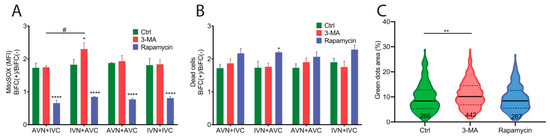 In parallel with the MitoSOX quantifications, PI was used to analyze the cell viability 48 h after transfection. Elevated cell death was observed in BiFC-positive cells compared to untransfected control cells. After transfection, cell death in BiFC-positive and control cells was determined to be 60% and 40%, respectively. The results are shown as a BiFC(+)/BiFC(−) ratio (Figure 5B). In transfected cells cultured in the presence of the autophagy inhibitor 3-MA, the measured cell death was comparable to that obtained from untreated transfected cells (Figure 5B). Rapamycin reduced the overall cell death compared to untreated transfected cells and 3-MA treated cells, but it was only in IVN + AVC-transfected cells that an increase in the BiFC(+)/BiFC(−) ratio was observed (Figure 5B).