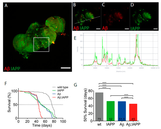 Transgenic Drosophila melanogaster provides an important model for protein misfolding diseases [43,44]. The expression of human IAPP, Aβ E22G, and the combination of IAPP + Aβ E22G all reduce the survival (Figure 6), and the expression of IAPP + Aβ E22G was more toxic than IAPP or Aβ E22G expression alone. IAPP and Aβ E22G are expressed behind a signal peptide, and both are expected to be secreted from the neurons, and from the images depicted, the immune reactivity appears to be extracellularly. In the double-transgenic flies, we could observe three different deposits composed of IAPP/Aβ, IAPP, and Aβ (Figure 6E). The intensity profile reveals the colocalization and supports amyloid deposits composed of IAPP and Aβ. Recently, Bharadwaj et al. [45] allowed IAPP and Aβ to form hetero-oligomers in vitro, and the morphological analysis identified aggregates with morphology distinct from homologous oligomers. Cytotoxicity studies on SH-SY5Y cells showed that co-aggregates of Aβ/IAPP were more toxic to the cells than the addition of aggregates composed of IAPP or Aβ alone. One possible explanation for the observed increased cytotoxicity could be the increased ability for IAPP/Aβ aggregates to interact with cell membranes [46].